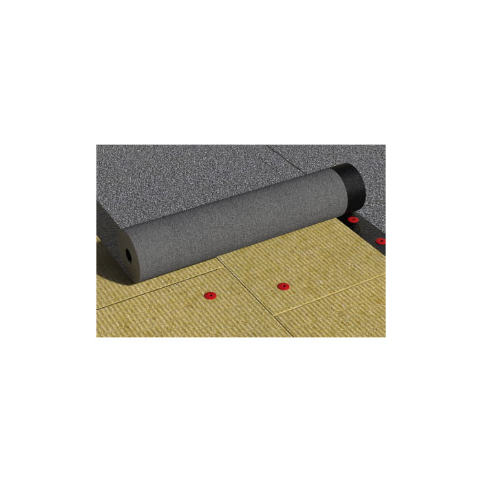 Рулонный битумно-полимерный СБС-модифицированный материал на нетканой основе из высокопрочного полиэстера с крупнозернистой посыпкой на верхней стороне полотна и мелкозернистой посыпкой на нижней.