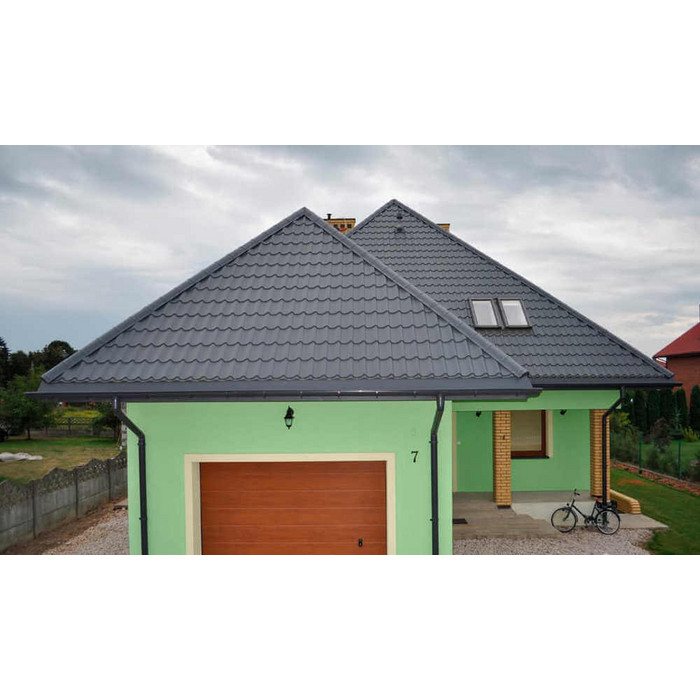 • Кровля защищена от механических воздействий, так как в основе металлочерепицы сталь толщиной 0.45 мм (с учётом металла, цинкового и полимерного слоя).