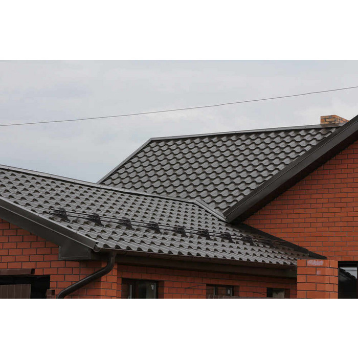 • Кровля защищена от механических воздействий, так как в основе металлочерепицы сталь толщиной 0.45 мм (с учётом металла, цинкового и полимерного слоя).