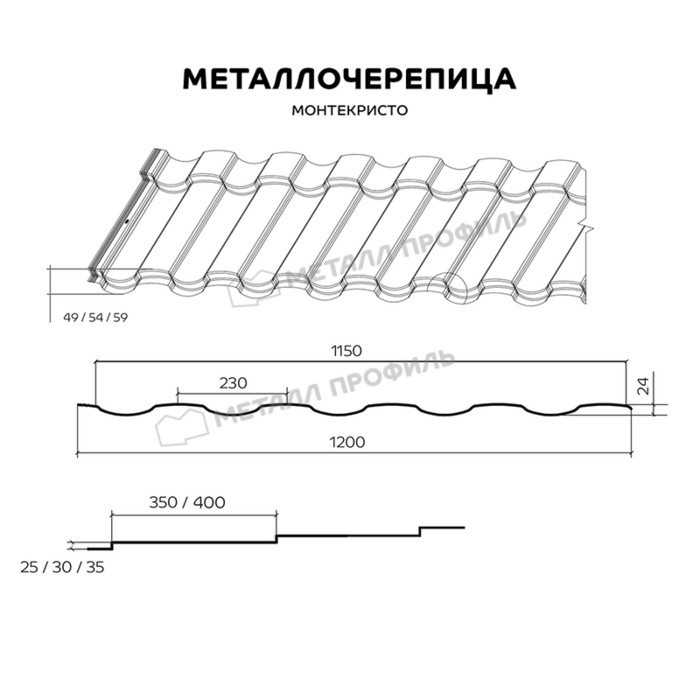 МОНТЕКРИСТО обладает целым рядом преимуществ. Это и незаметные стыки, изготовленные по технологии горизонтального 3D-реза, и модифицированная форма бокового замка, защищающая от протечек. Металлочерепица МОНТЕКРИСТО — это сочетание жёстких линий и скруглённых форм, которые гармонично будут сочетаться практически с любым дизайнерским решением — от модерна до хай-тек. Мы предлагаем потребителю возможность подобрать наиболее подходящее соотношение параметров кровли. Подобрать можно как высоту ступеньки (25/30/35 мм), так и её длину (350/400 мм). Большой спектр сочетаний призван удовлетворить персональные запросы покупателя.