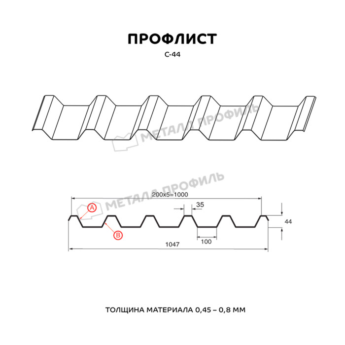 Наиболее рельефный профиль марки С в ассортименте Компании Металл Профиль. Такая маркировка несёт информацию, что это «стеновой» материал, впрочем разделение профлиста по области использования довольно формально. С-44 применяется как в индустриальном, так и в гражданском строительстве. Волна этого профиля имеет высоту 44 мм, толщина стальной основы 0,45-0,8 мм. С-44 обладает отличной стабильностью и улучшенной жёсткостью. в сооружениях, подверженных повышенным нагрузкам. Среди них: торговые точки, ограждения для частных территорий, промышленных зон и стройплощадок, несъёмная опалубка, кровли скатных крыш, бытовки, гаражи. Материал С-44 отличается неуязвимостью к коррозии, к влиянию агрессивной среды, погодным факторам. Обладает одновременно высокой прочностью и небольшим весом. Также он несложно и понятно монтируется. Срок службы С-44 может достигать 50 лет, в соответствии с гарантийным сроком выбранного покрытия. Полимерный слой создаёт металлопрокату элегантный вид и дополнительные качества.