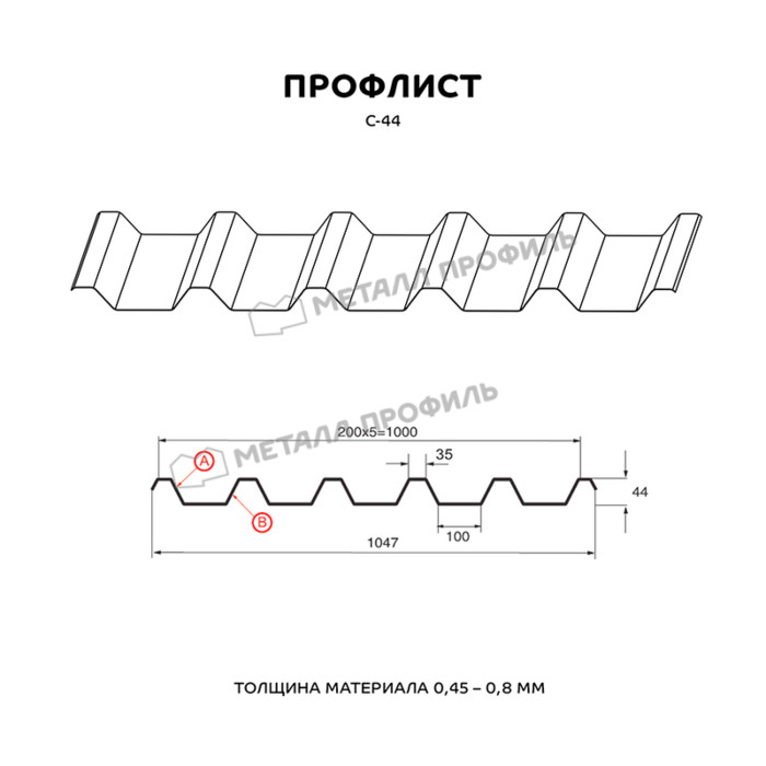 Гофрированный лист С-44 используется фактически в любых сферах строительной отрасли. Он в равной степени популярен как в частном секторе, так и на промышленных объектах. Профнастил с глубиной гофры 44 мм характеризуется довольно высокими несущими показателями. Это наиболее высокий из профилей с обозначением С – «стеновой». Он незаменим, если вам необходимо: оборудовать хозяйственные помещения, возвести стены и перегородки в щитовых постройках, сделать кровельное покрытие, поставить ограждения. Также С-44 отличается подходящей прочностью для строительства каркасов различных сооружений и несъёмной опалубки для железобетона. Профиль С-44 можно использовать в областях с суровым климатом. Стороны этого профиля несимметричны. Верхняя сторона (А) имеет более ритмичный рисунок из узких полочек и рекомендована для кровли. Сторона В смотрится более монолитно, рекомендована для всех остальных сфер применения.