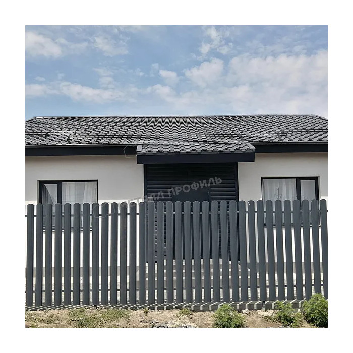 - Благодаря декоративно-защитному покрытию Штакетник металлический МП LАNE-T 16,5х99 NormanMP (ПЭ-01-9006-0.5) не выгорает.