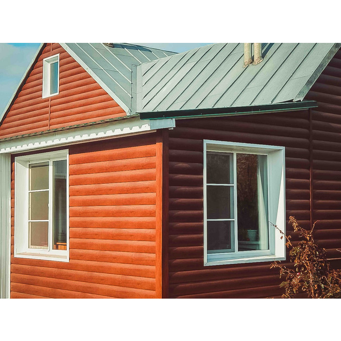 • В отличие от облицовки фасада деревом, сайдинг под бревно металлический «Блок-хаус GL» прост в монтаже и не требует дополнительного послемонтажного ухода.
