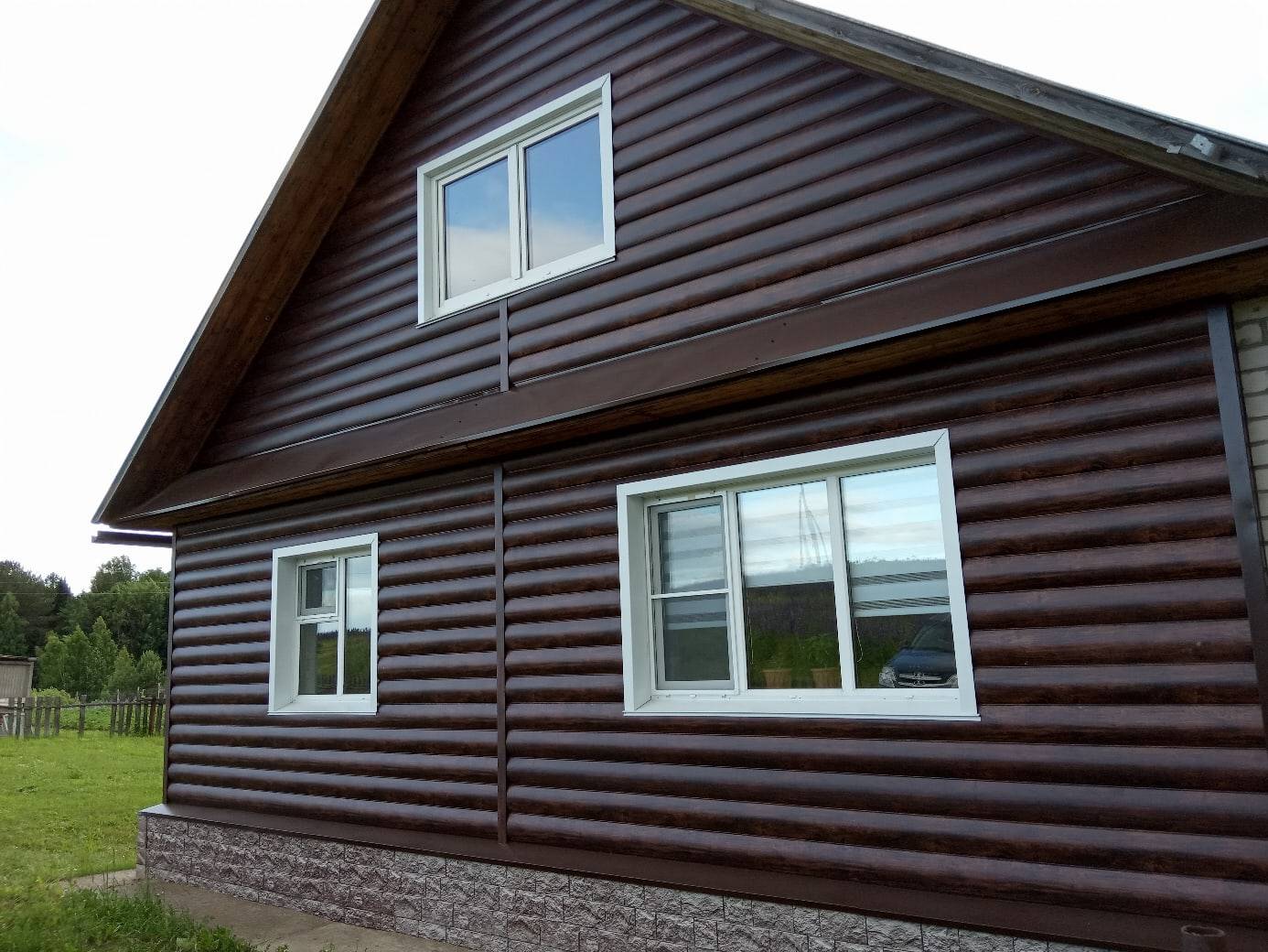 • В отличие от облицовки фасада деревом, сайдинг под бревно металлический «Блок-хаус GL» прост в монтаже и не требует дополнительного послемонтажного ухода.